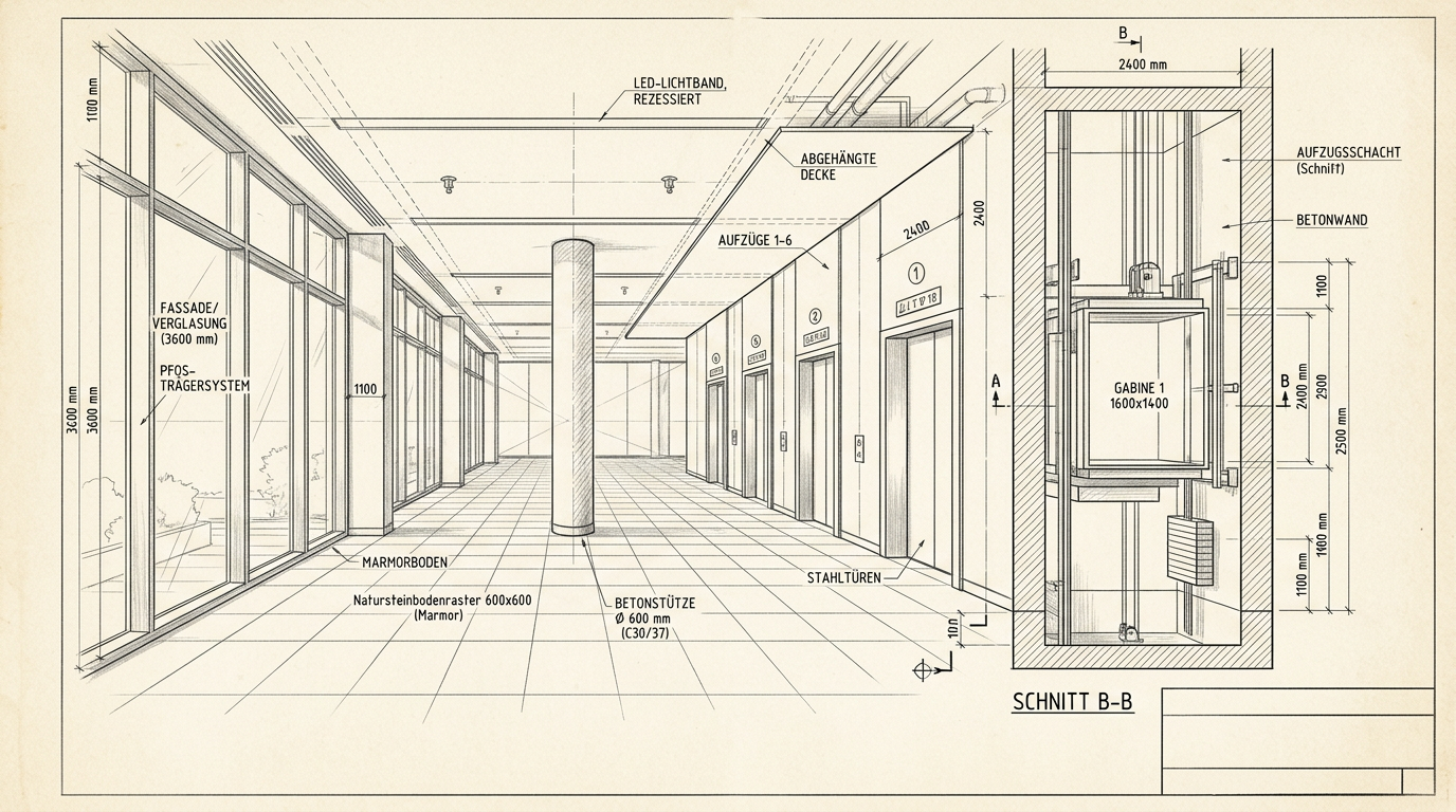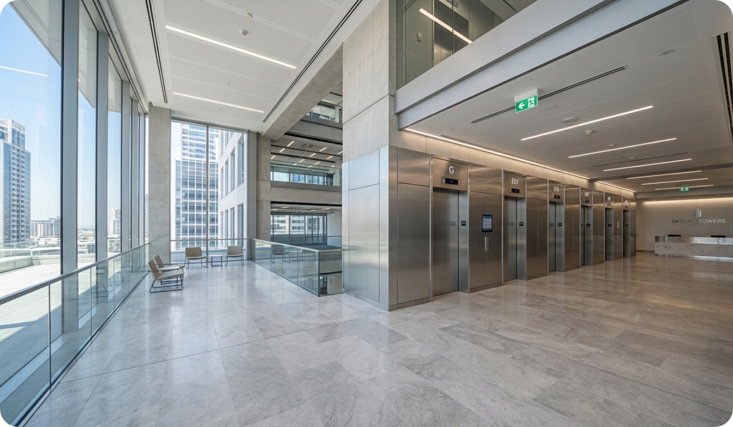 Full lobby redesign with panoramic lift integration, updated control panels, and premium passenger flow guidance.